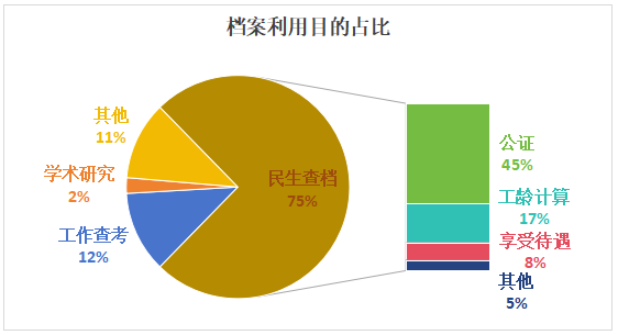 注:2025年,市档案馆根据档案权属及业务范围,优化窗口功能布局与人员配置,市社保中心入驻查档中心,设立企业职工档案查档专窗,实行查档业务分流(上表数据不包含市社保中心数据)。 二、档案利用情况分析 1.民生档案利用仍为重中之重 民生查档一直以来都是档案利用服务的核心领域,2025年,民生档案利用占全年总查档利用人次75%,其中办理产权、存款等公证,计算退休工龄,享受各类待遇,办理婚姻为群众主要查档目的,主要查阅工龄档案、职工登记表、退休职工档案、婚姻登记等相关档案。