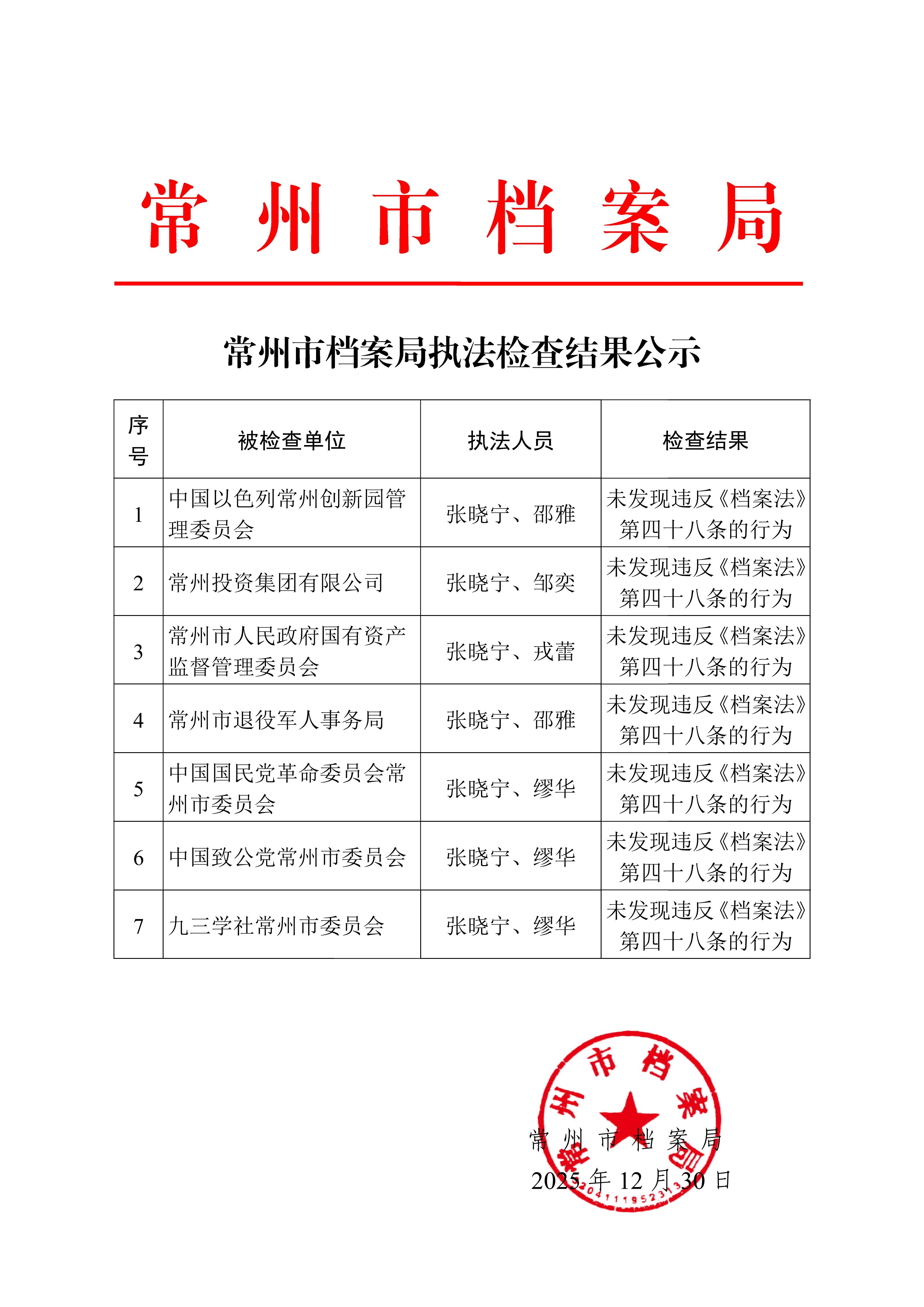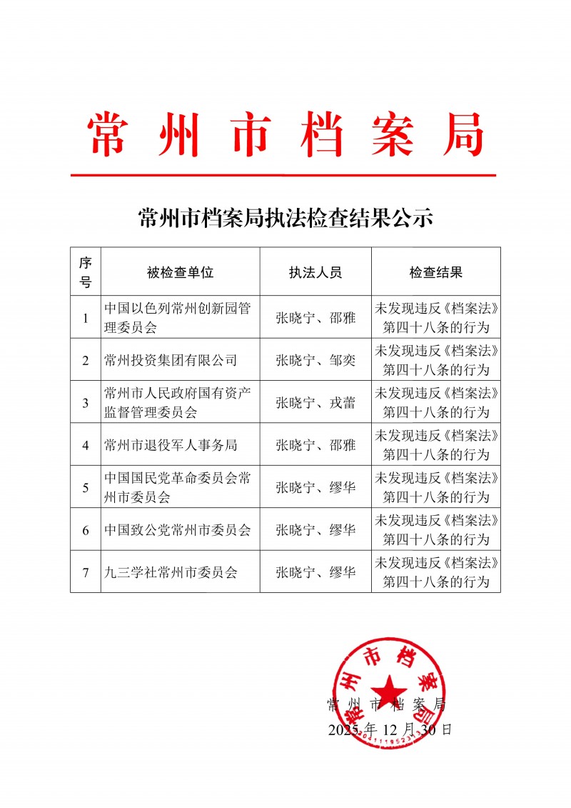 常州市档案局执法检查结果公示